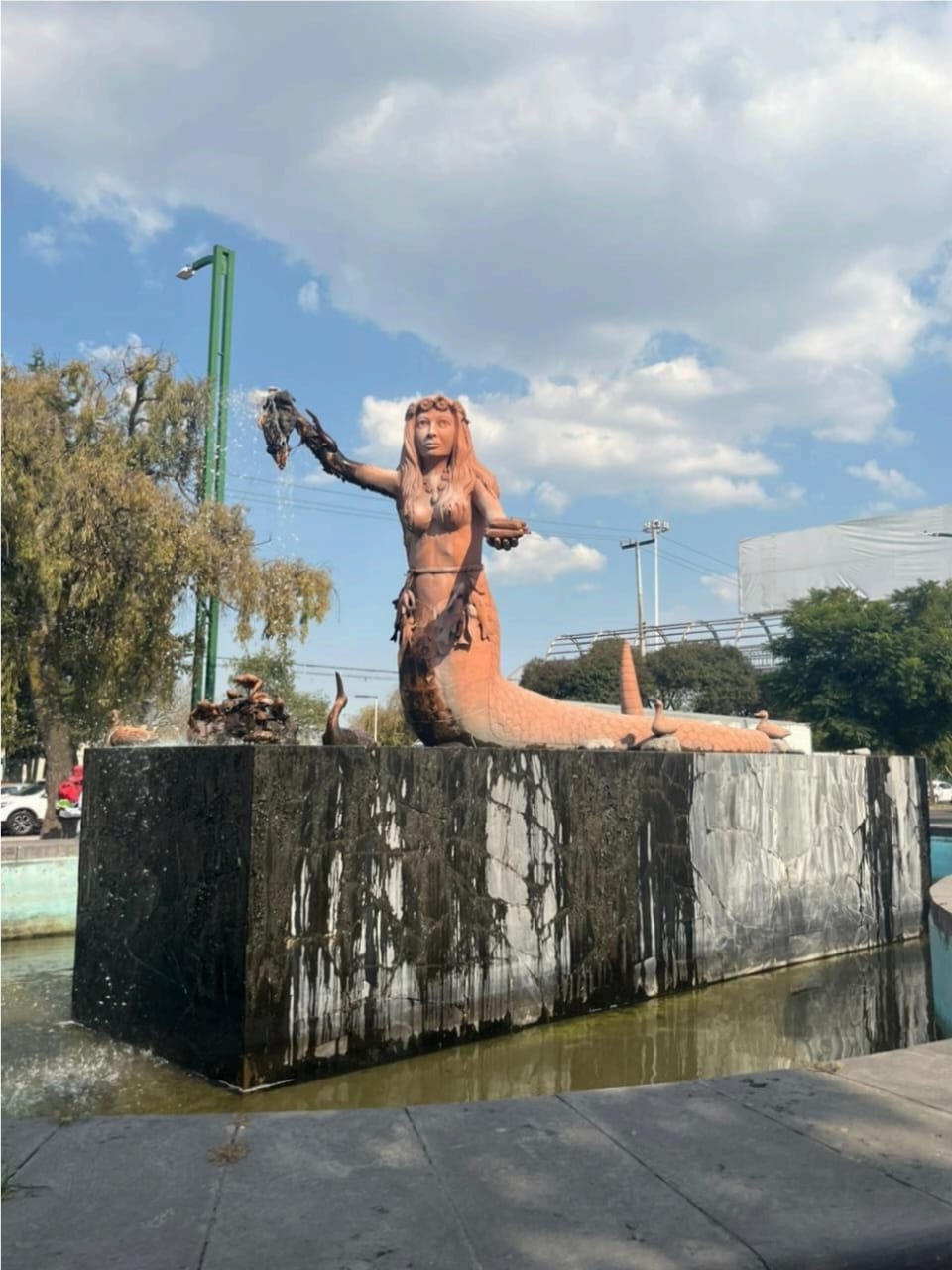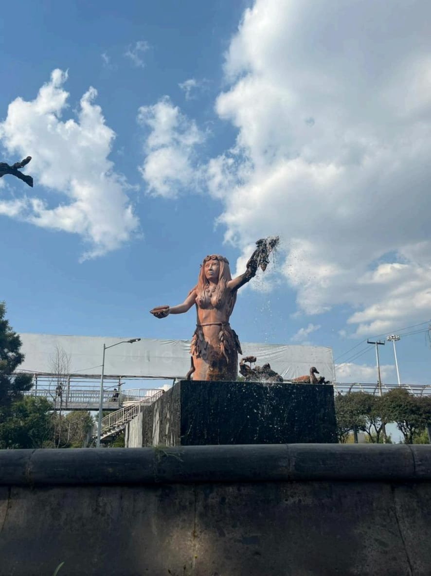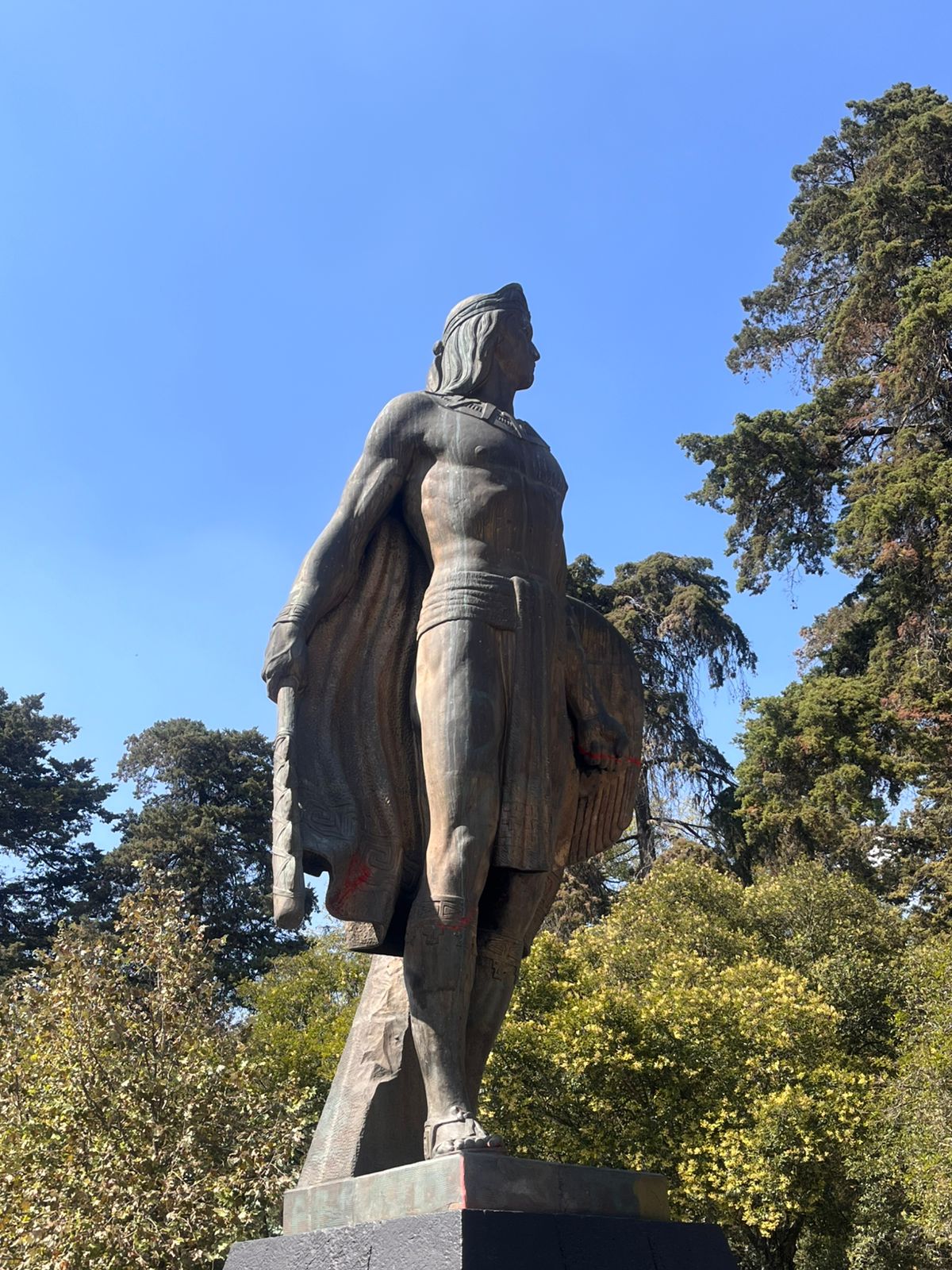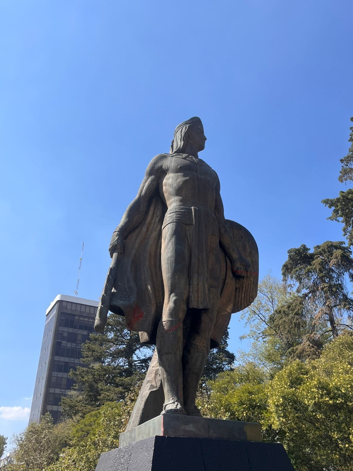 La escultura del guerrero muestra cómo el entorno urbano transforma lentamente incluso a las figuras más sólidas, el clima desgasta sus superficies, la contaminación se adhiere a su cuerpo y las marcas de vandalismo interrumpen su forma original. Cada mancha y cada rasguño cuentan la historia del abandono, aun así, el guerrero permanece firme, convirtiéndose en un recordatorio de que el patrimonio necesita cuidado constante para conservar la historia que guarda en silencio.