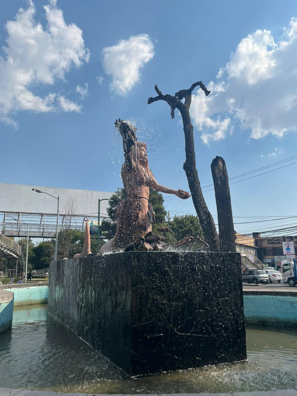 La figura central de la fuente parece haber perdido el brillo y la armonía que alguna vez transmitió. El deterioro visible, el agua turbia y los elementos dañados que la rodean evocan una melodía que, con el tiempo, se ha ido apagando.